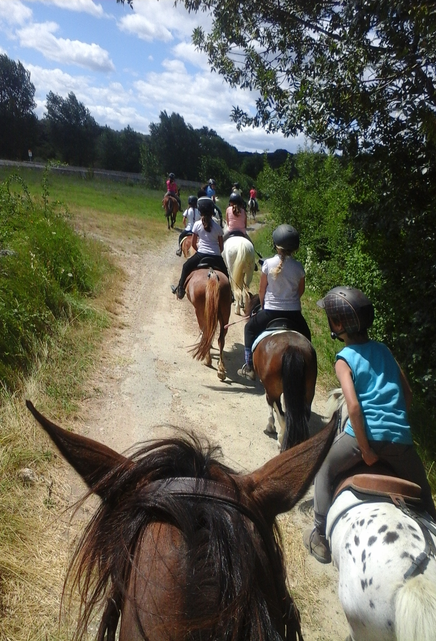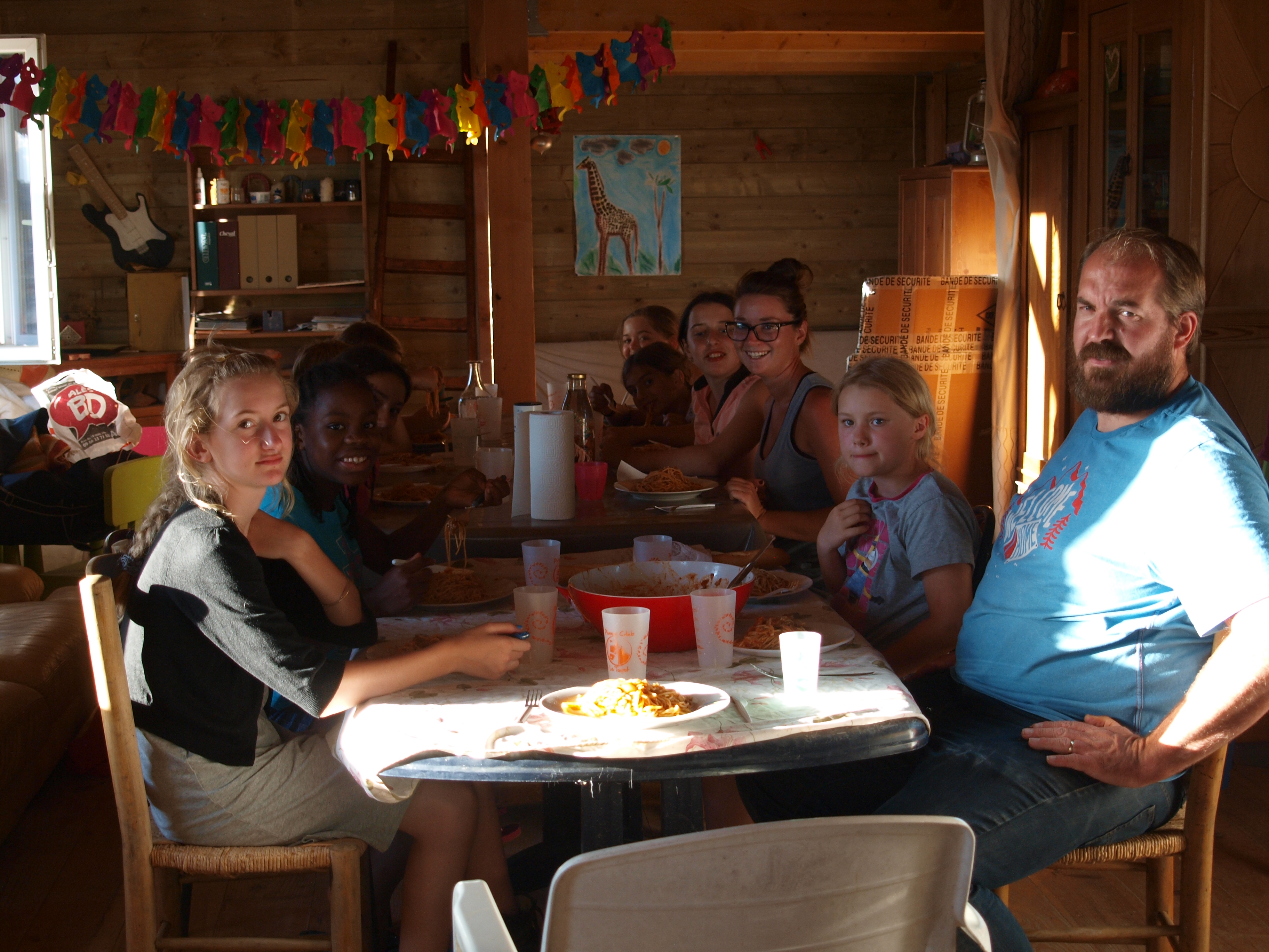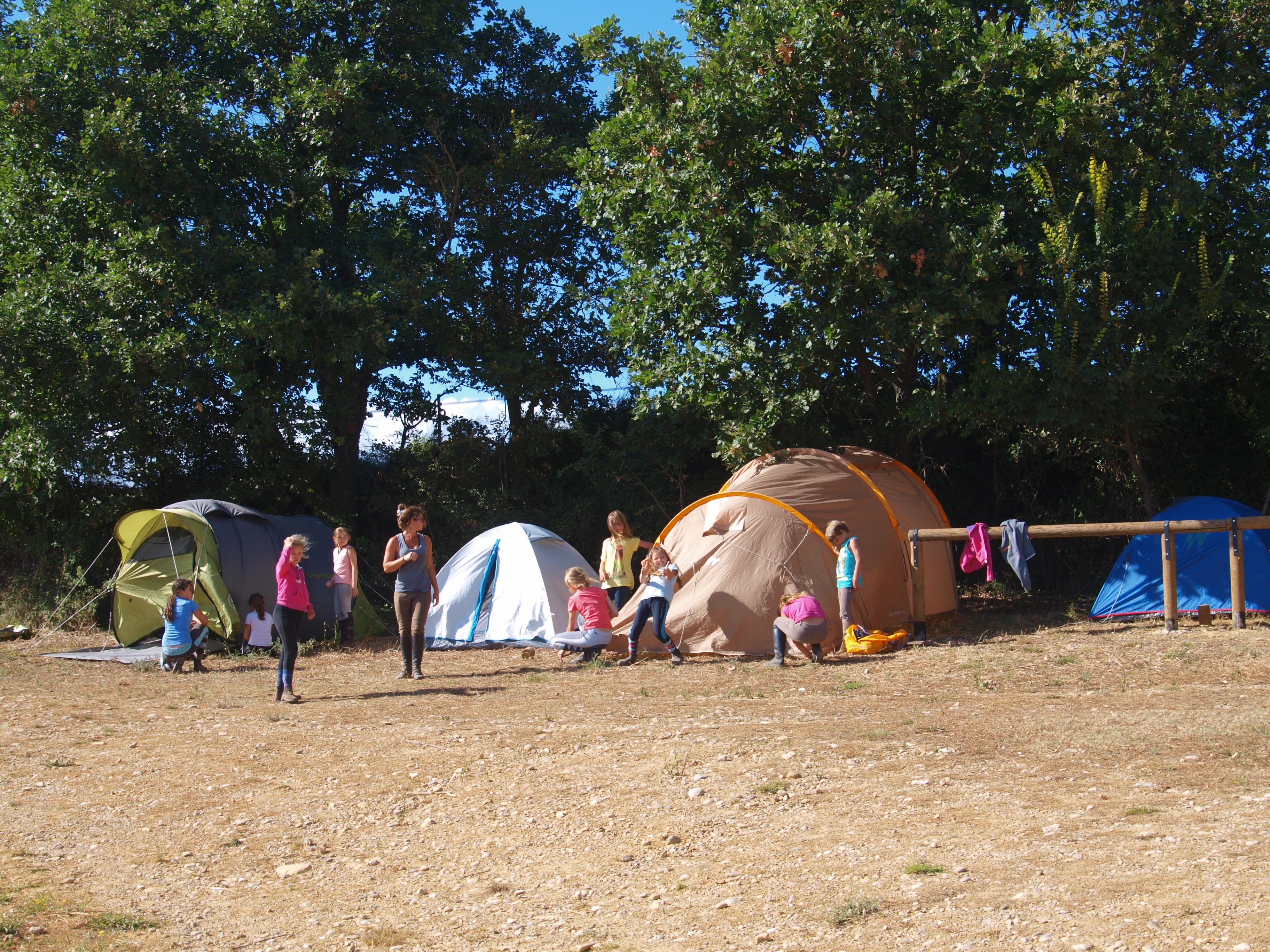 Nous avons déjeuné, puis emballé les affaires et nous avons préparé les poneys, alors que Maëlle est parti chez le médecin ( tout va bien!). Et nous sommes partis pour une balade agitée…même si Pelous était tenu par une longe. Nous avons faits une pause pour manger le pic-nic du midi, un repas très mouvementé. Nous sommes repartis pour deux heures de marche. Nous sommes arrivés au club house, déchargés les bagages et monter les tentes. Après avoir pris une bonne douche, nous nous sommes mis à table pour déguster les bonnes pâtes bolo que nous a préparé Christelle. Nous allons jouer au loup garou, alors on vous laisse!